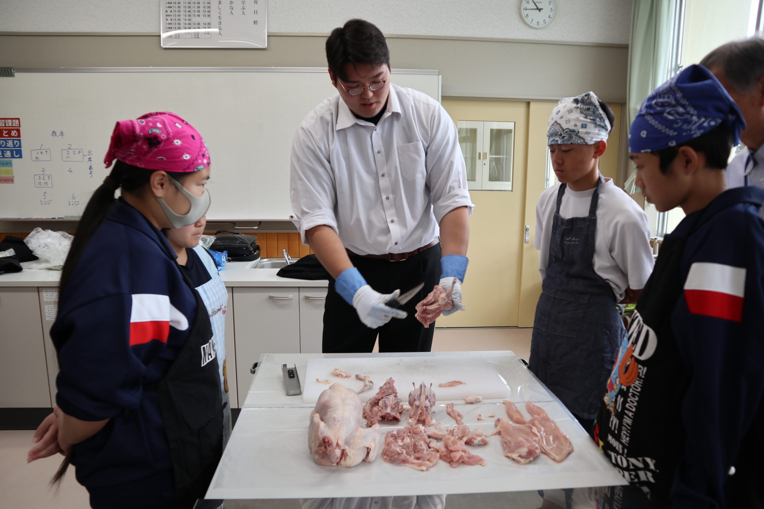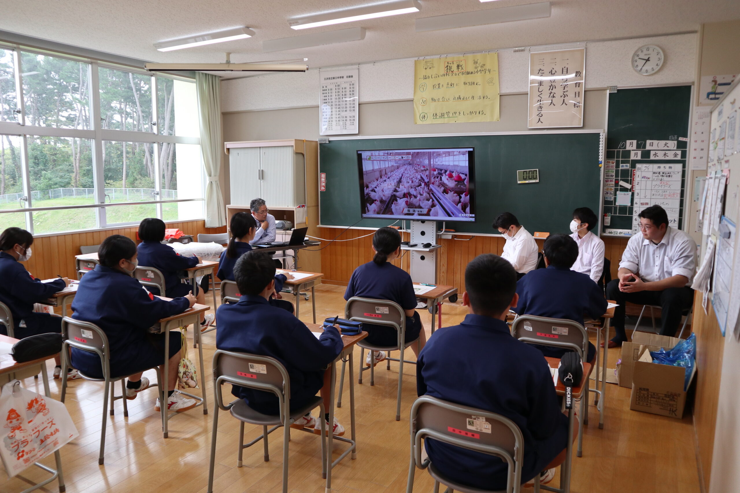10月7日、三沢市立第三中学校で2年生を対象にプライフーズ(株)による出前授業が実施されました。元々食鳥処理工場を見学希望でしたが10月から鳥インフルエンザ防疫強化期間で施設内立入り不可の為、学校での出前授業となりました。生徒12名が食鳥の生産処理から製造出荷、加工食品製造までを動画や担当者の説明で学習し、丸鶏の解体実演も行われました。質問タイムでは担当者も驚くほどたくさんの手が上がり、最後は皆で試食タイムを楽しみました。