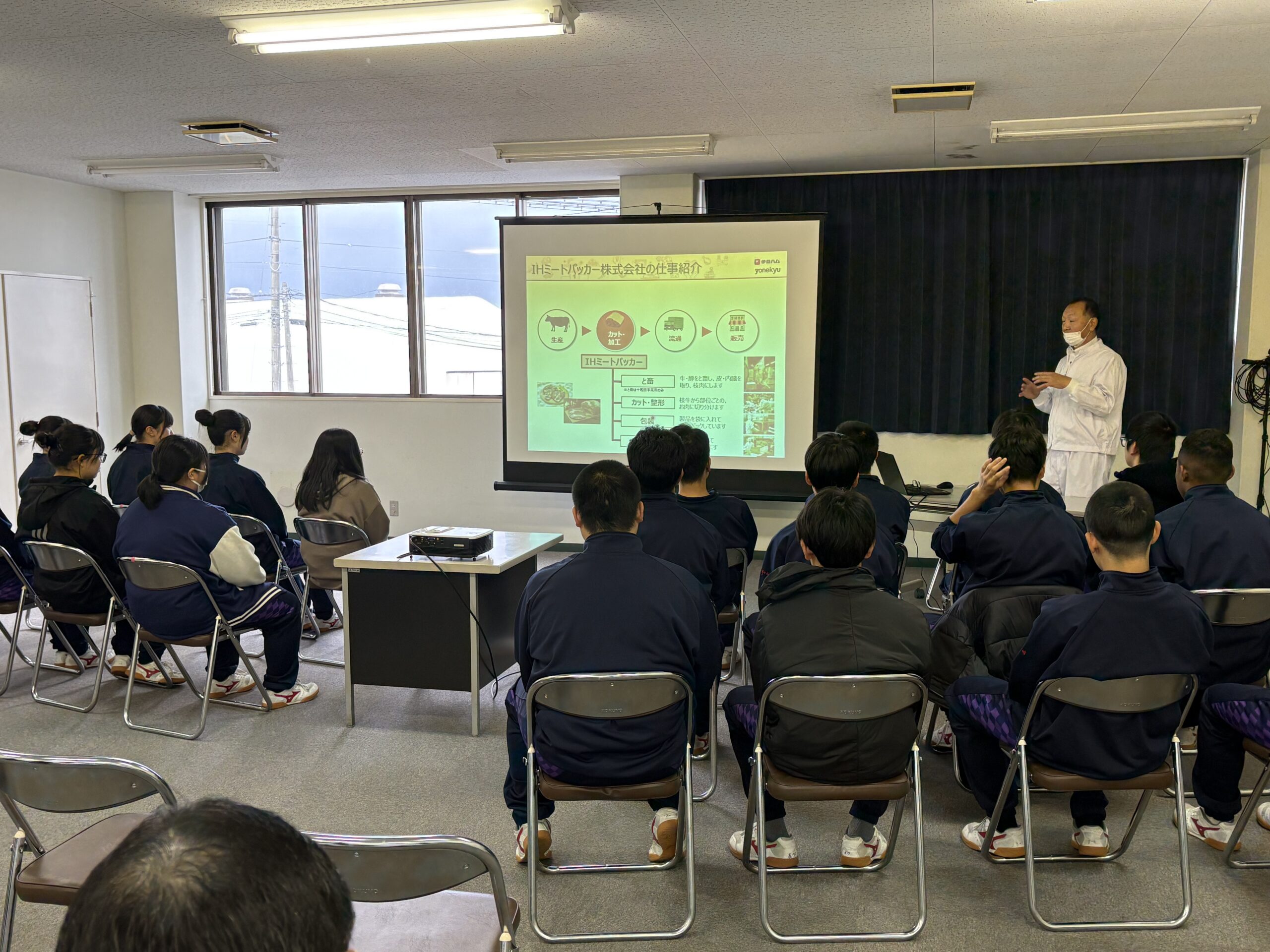 11月11日、青森県立三本木農業恵拓高等学校の生徒24名が、IHミートパッカー㈱十和田ミートプラントと十和田ビーフプラント(十和田市)を見学しました。生徒たちは初めて見る牛及び豚の生体と畜から解体、食肉加工までを見て、普段食べている肉となるまでにたくさんの工程とそこに携わる人たちの努力があること、そして命をいただくことへの感謝の気持ちを新たにする機会となったようです。