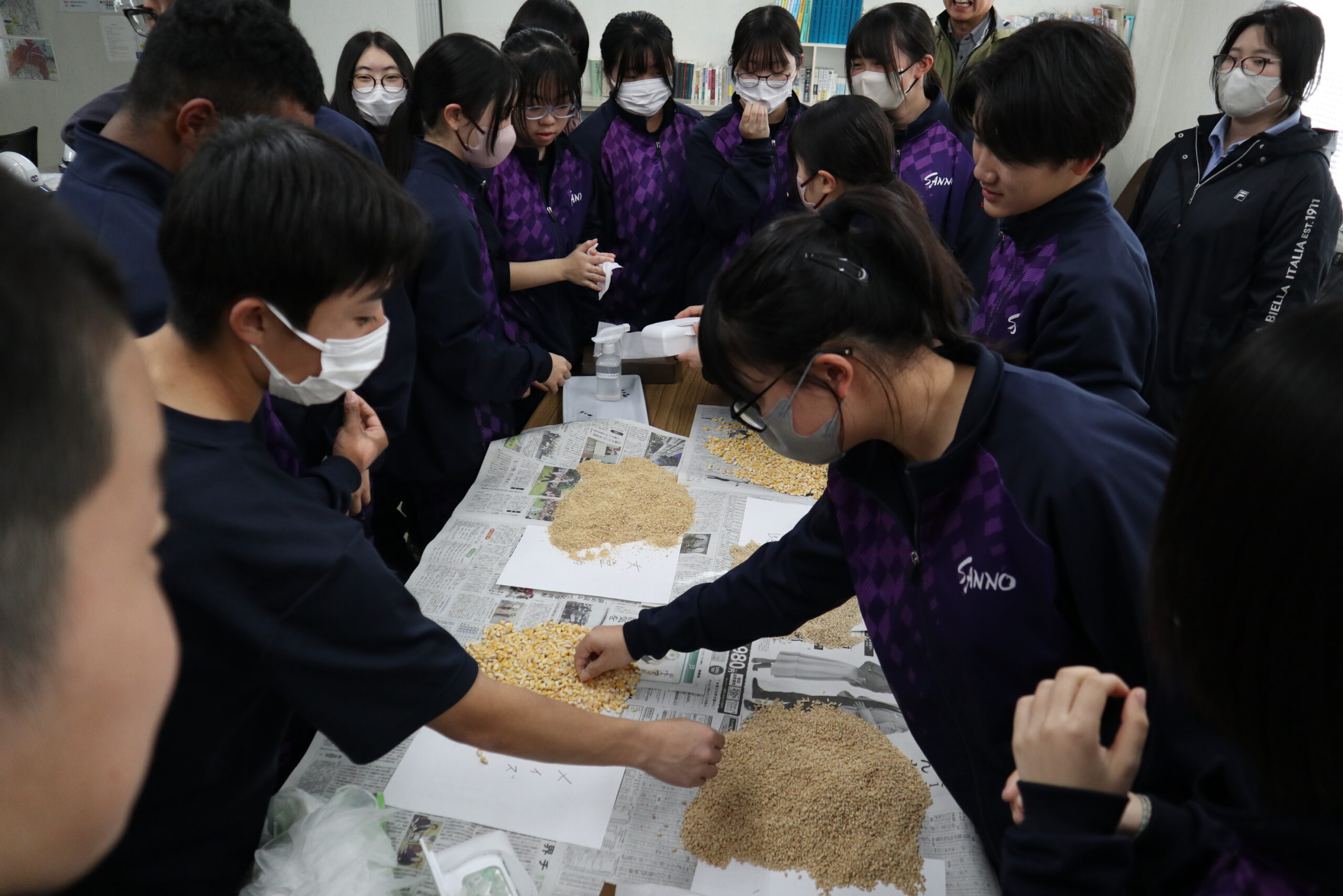 サイロで扱う飼料原料を味見する生徒も