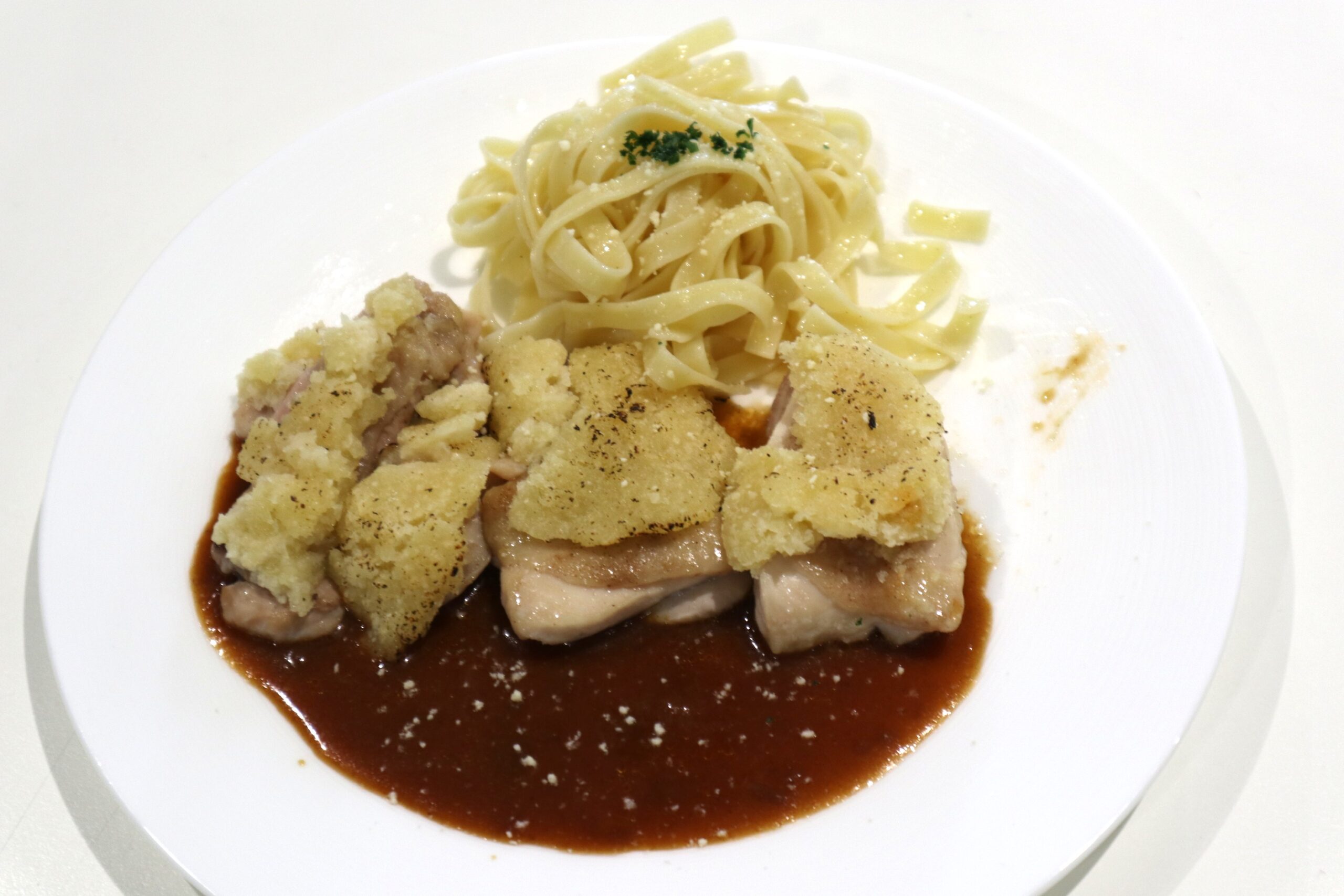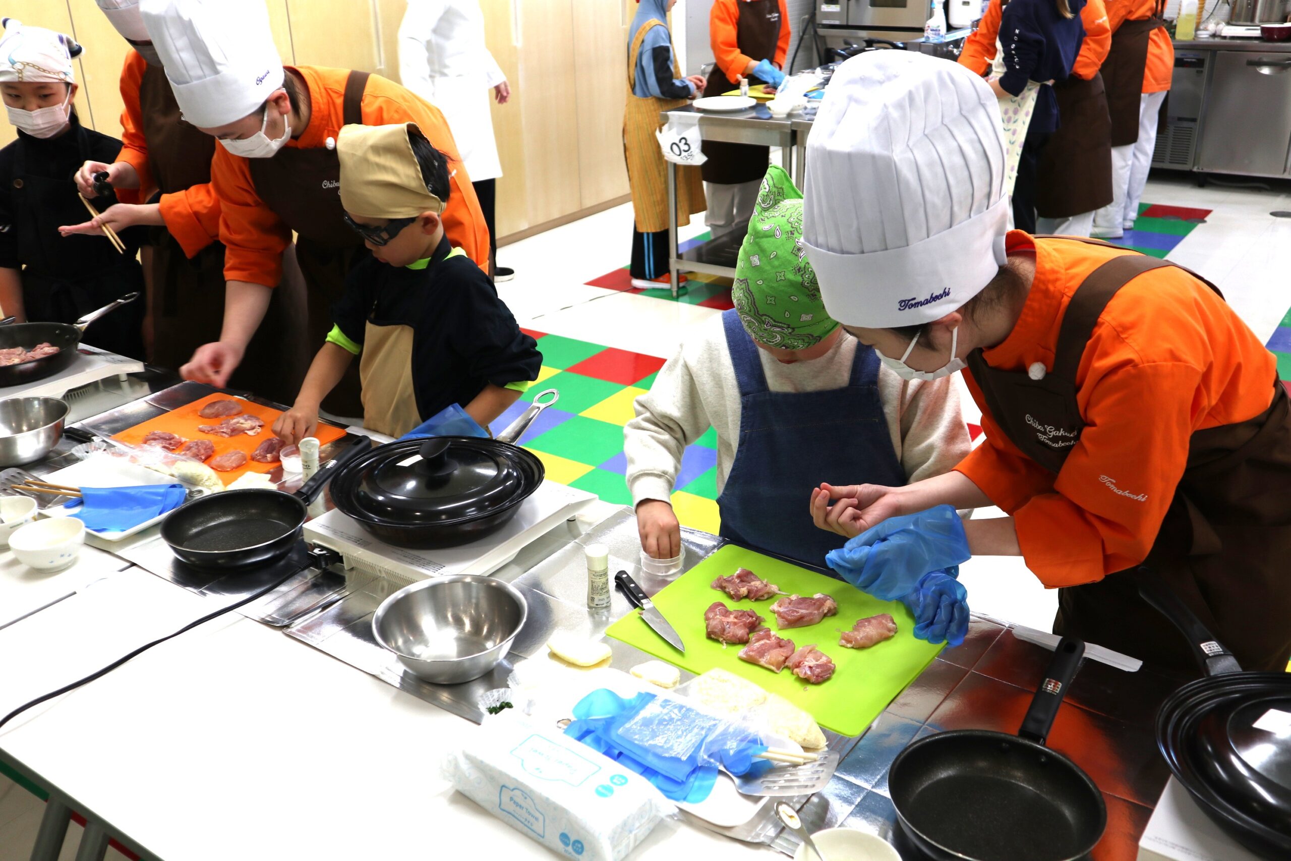 1月31日、「はっち」(八戸市)で小学生14名が千葉学園高等学校調理科の生徒と一緒に、青森県産鶏肉を使って「鶏肉のフォワイヨ風」作りに挑戦。下味を付けた鶏もも肉を皮目から焼いて、裏返して白ワインで蒸し焼きに、バターに生パン粉と粉チーズを混ぜた衣をのせてバーナーであぶって、本格的な洋食メニューが出来上がりました。鶏肉を提供したプライフーズ㈱様の出前授業もあり、美味しくて楽しい学びの場ともなりました。